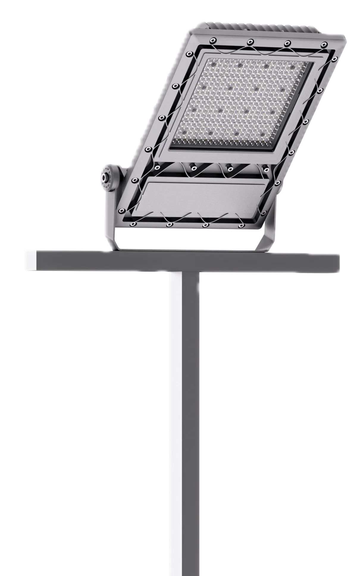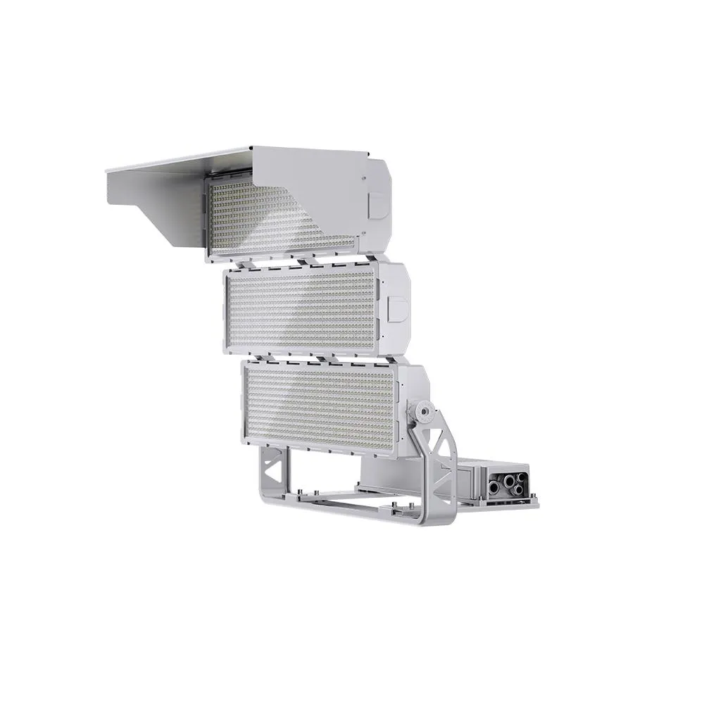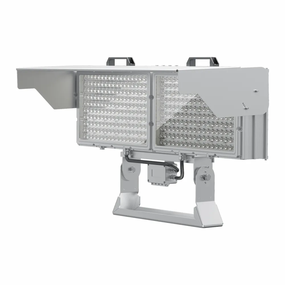 Proyector LED de alto mástil para estadios y complejos deportivos. Flujo de 306.000 lm, visor antideslumbrante y eficiencia de 170 lm/W.