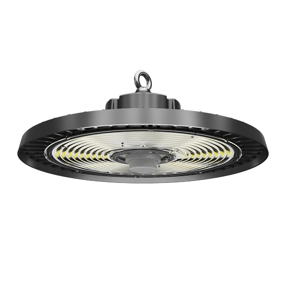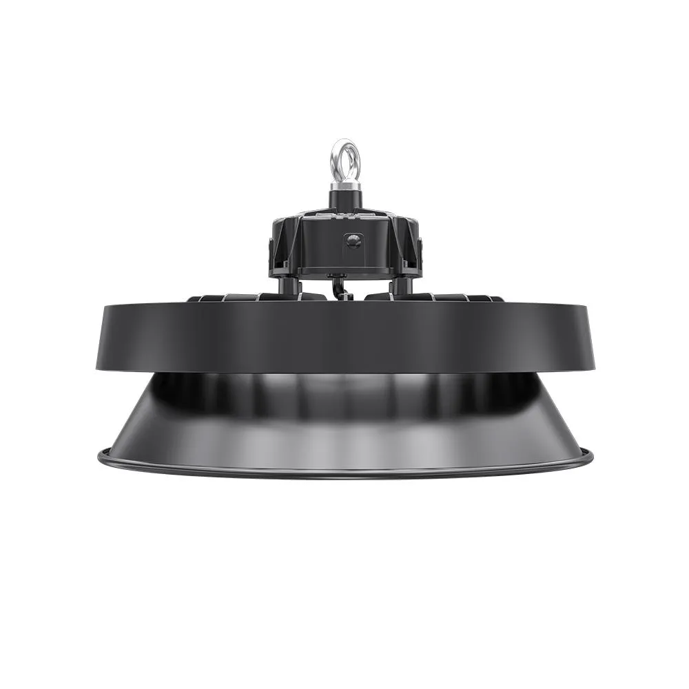 Campana LED UFO con diseño aerodinámico y excelente disipación térmica, ideal para espacios industriales y comerciales. Ofrece eficiencia de 170 lm/W, control DALI-2 / 0–10V, y una vida útil superior a 102.000 horas, garantizando rendimiento y fiabilidad.