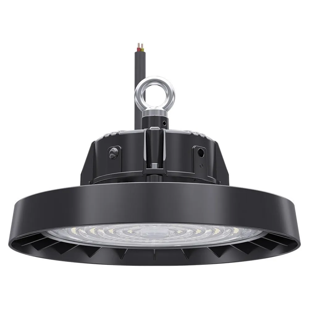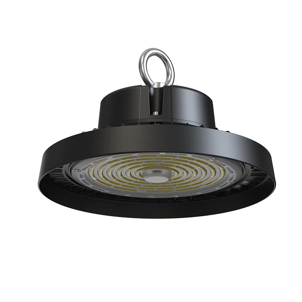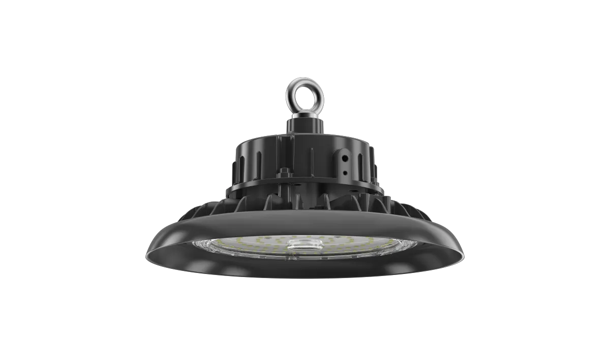 Campana LED tipo UFO de alto rendimiento y bajo deslumbramiento, ideal para naves industriales y almacenes logísticos. Eficiencia de 190 lm/W, cuerpo de aluminio fundido ADC12, control DALI-2 o 1–10V, y protección IP65 / IK08 para un rendimiento constante y duradero.