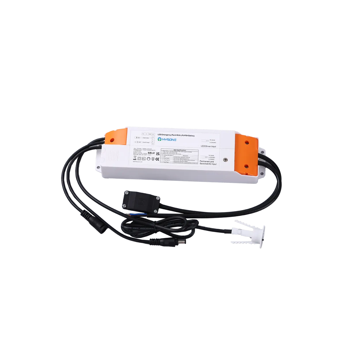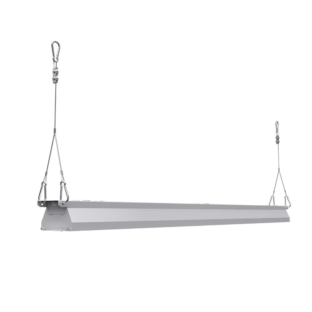 Campana lineal LED con versión de emergencia integrada (3h). Alta eficiencia de 200 lm/W y diseño compacto para tiendas y talleres.
