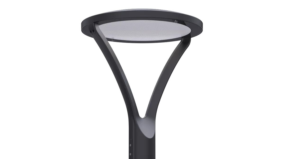 Luminaria LED Post Top con diseño decorativo. Ópticas tipo II/III/IV, eficiencia 170 lm/W y protección IP66 IK08.